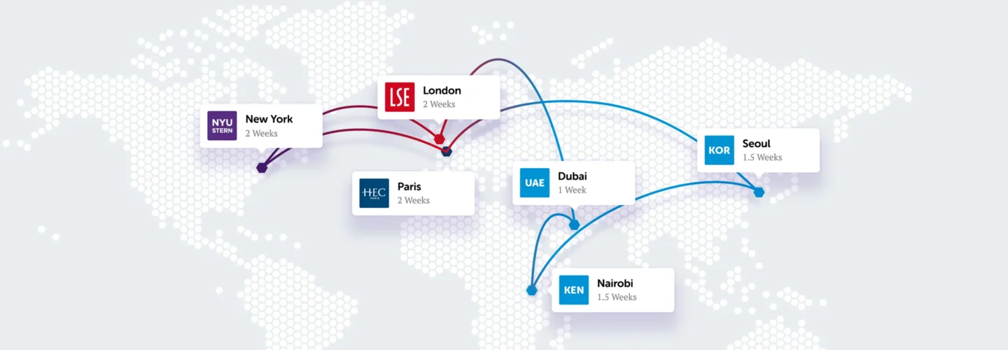 Six immersive modules will take you to four continents over 18 months – starting with foundational MBA subjects at the partner schools in London, New York and Paris, then moving onto advanced topics, taught in the dynamic future-focused cities of Seoul, Nairobi and Dubai.